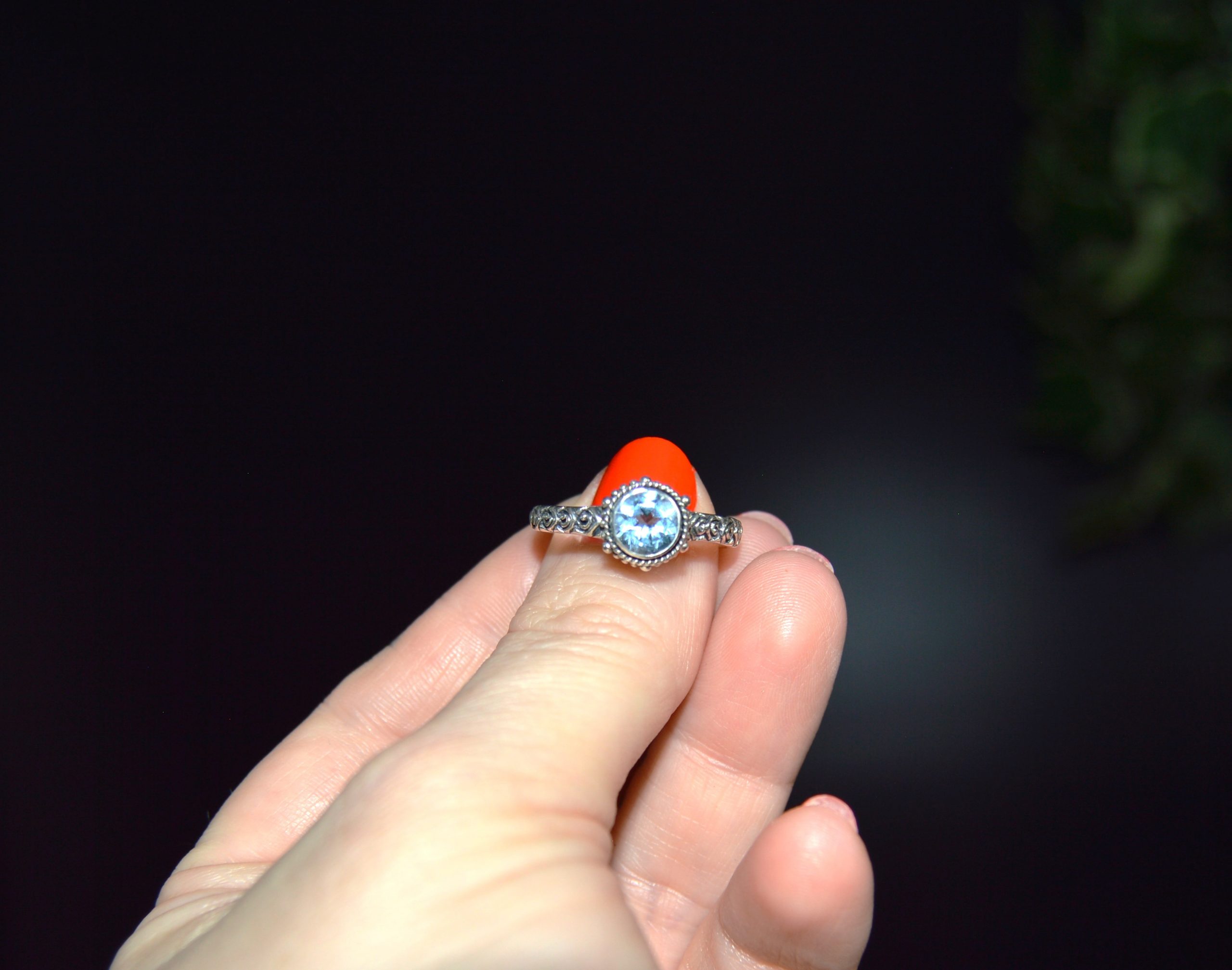 This elegant size 8 ring features a serene aquamarine gemstone set in sterling silver, evoking the beauty of tranquil seas. Fun fact: sailors once believed aquamarine offered safe passage across oceans!