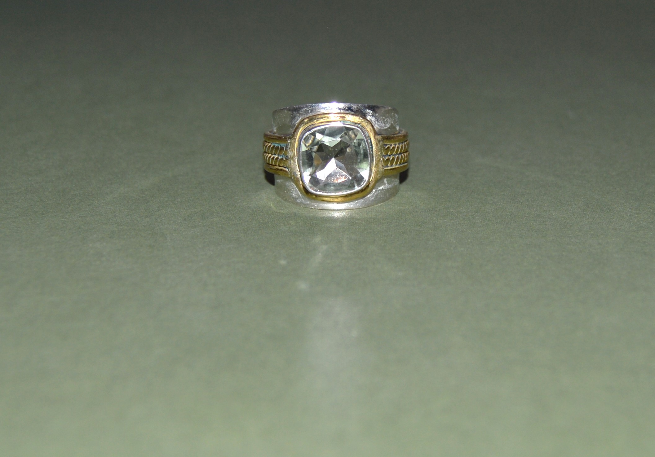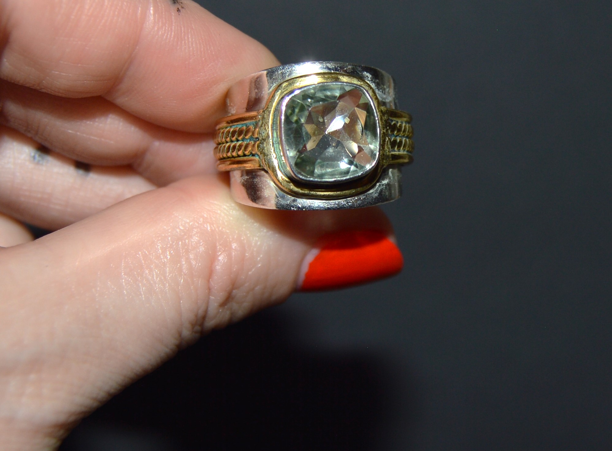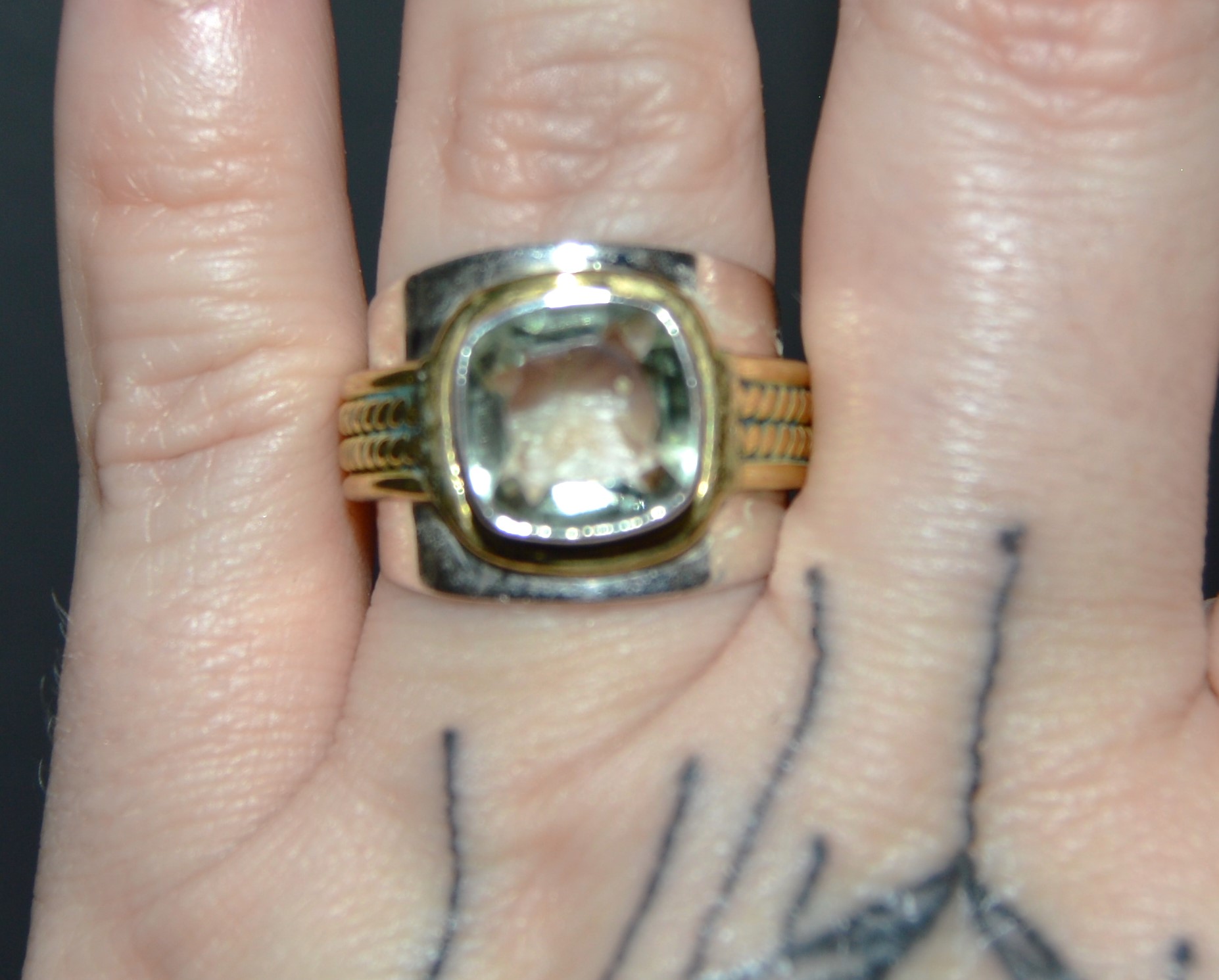 Exquisitely forged in sterling silver with sumptuous yellow gold accents, this ring captivates with a bewitching green amethyst that radiates refined elegance and opulent allure.