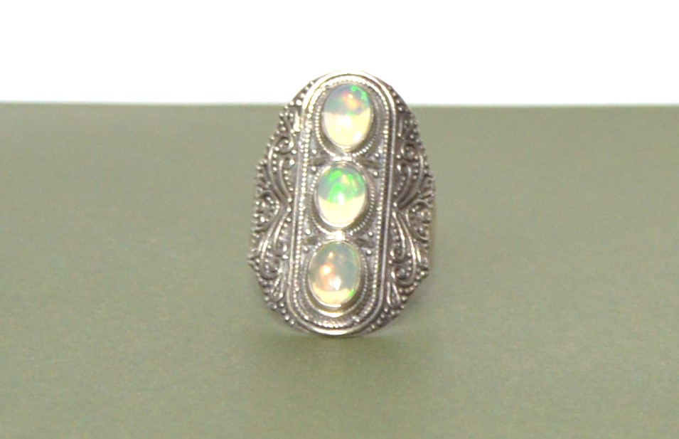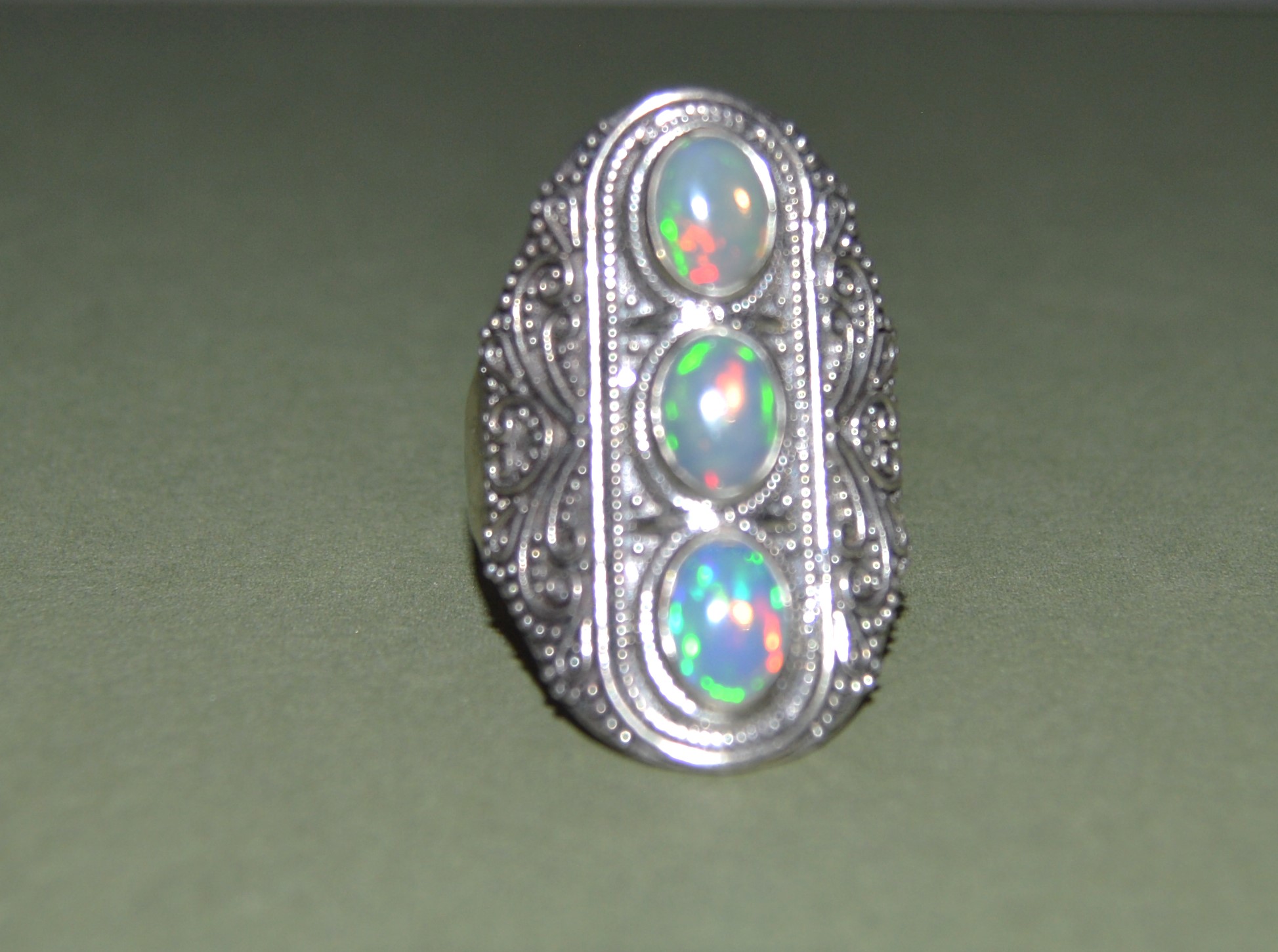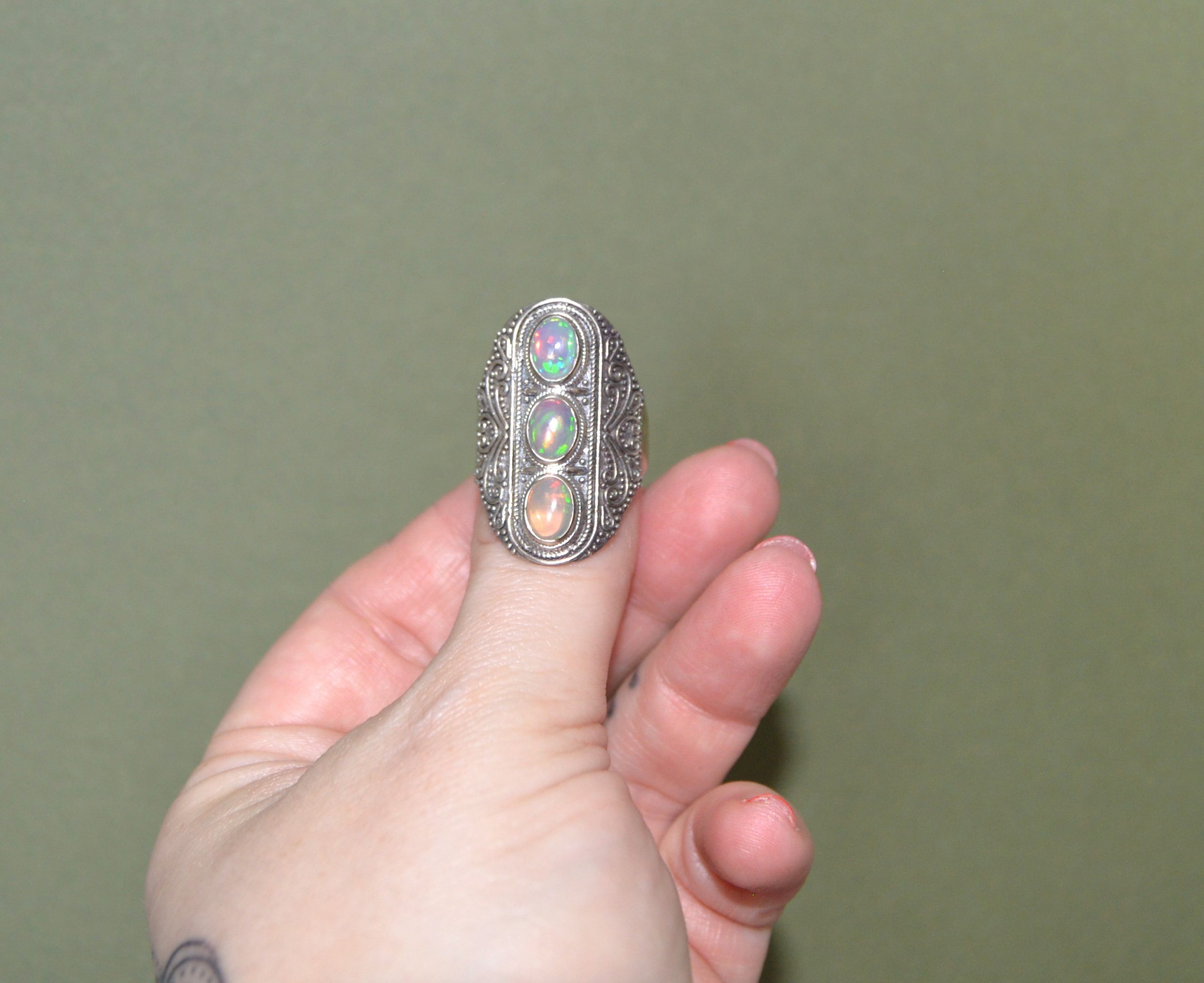 This bold size 9 shield ring is a true statement piece, designed to captivate attention with its unique style. Crafted with meticulous detail, the ring features three striking oval fire opal stones running vertically down the center. Each opal dazzles with a fiery play of colors, from vibrant reds to warm oranges, evoking the mesmerizing…