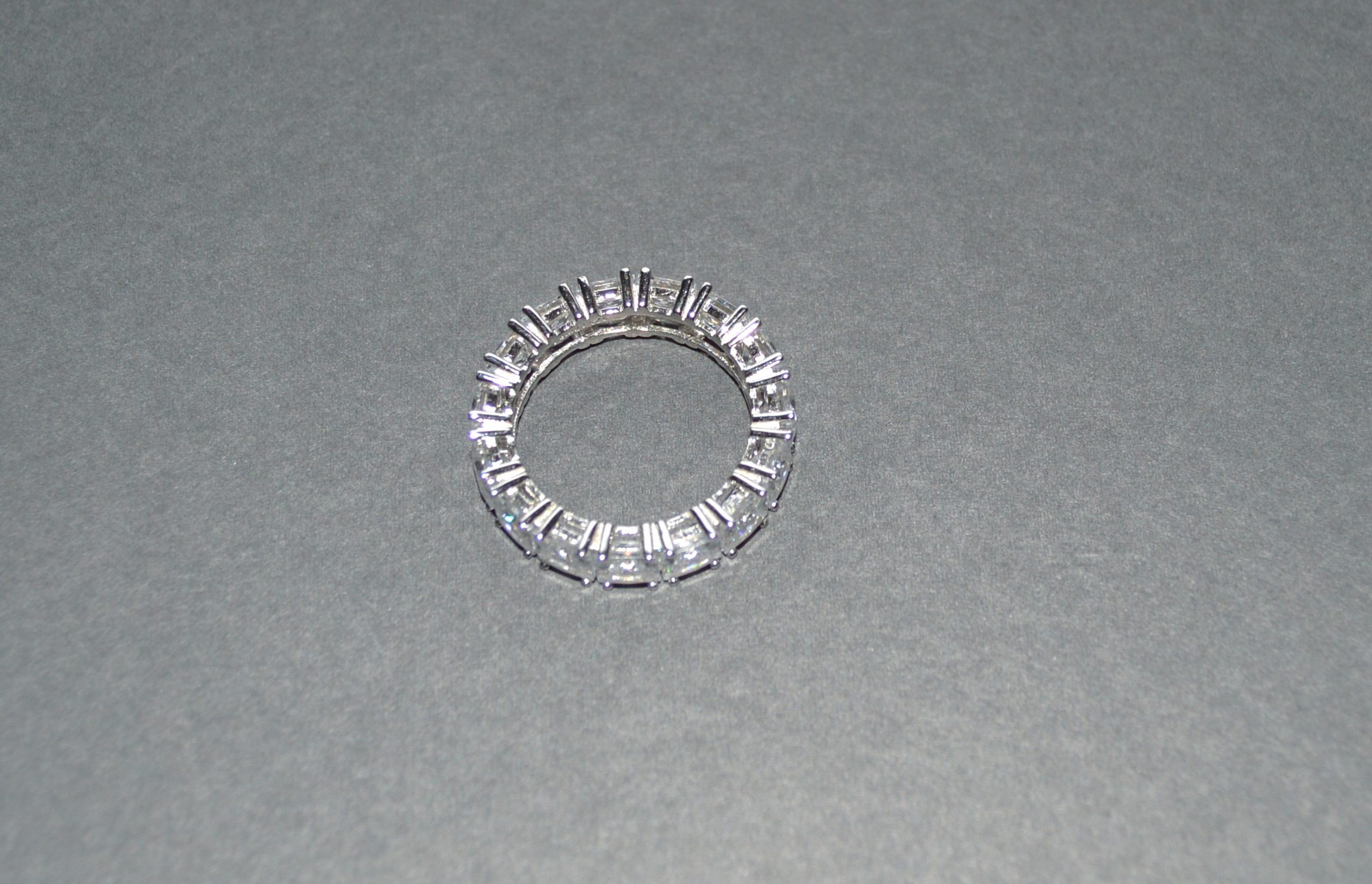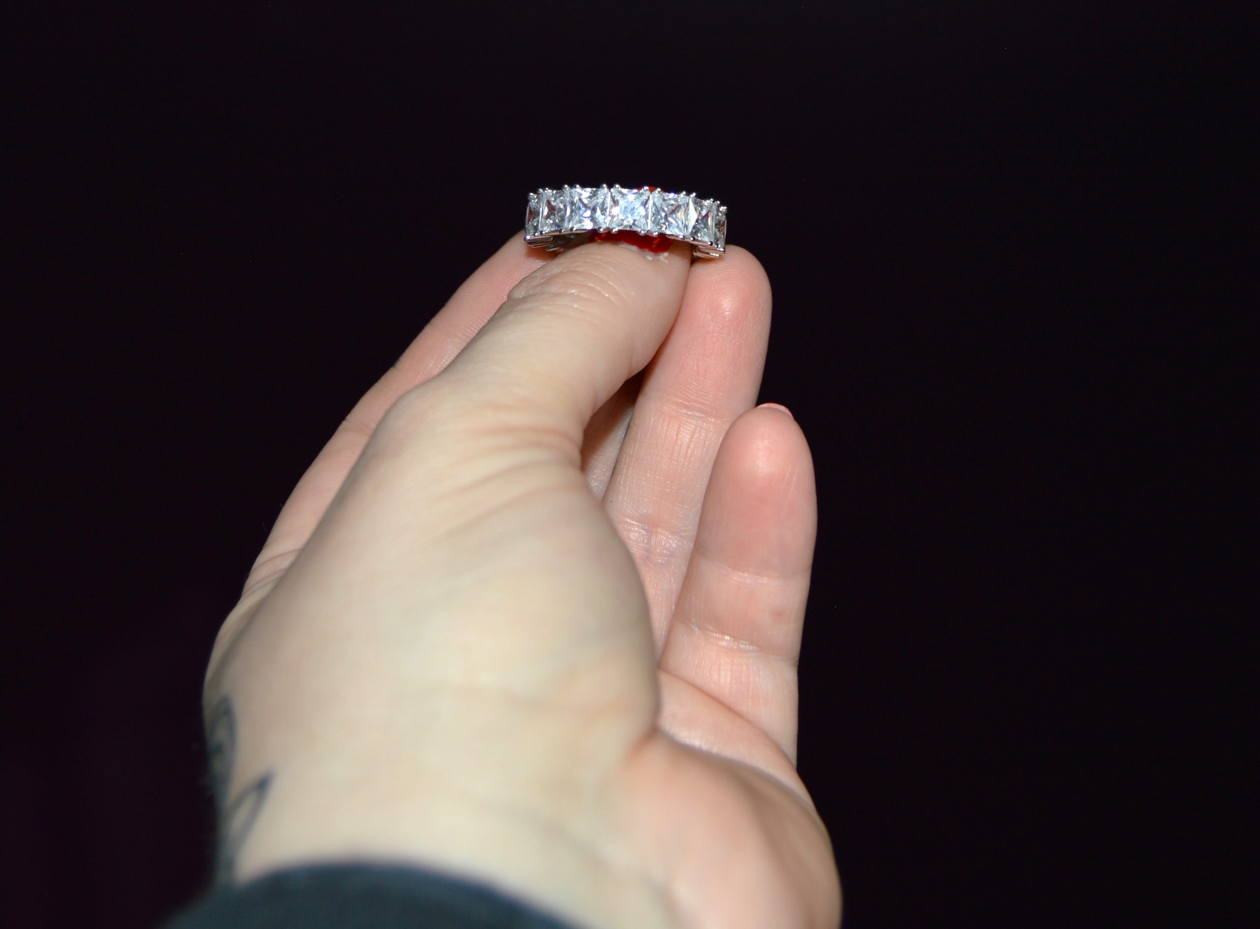 This bold and glamorous size 8 1/2 ring features a wide sterling silver band, radiating a sense of strength and sophistication. The band is encircled by 16 large cubic zirconia stones, set closely together to create a thick, continuous line of dazzling brilliance. Each stone is expertly faceted, reflecting light from every angle for an…