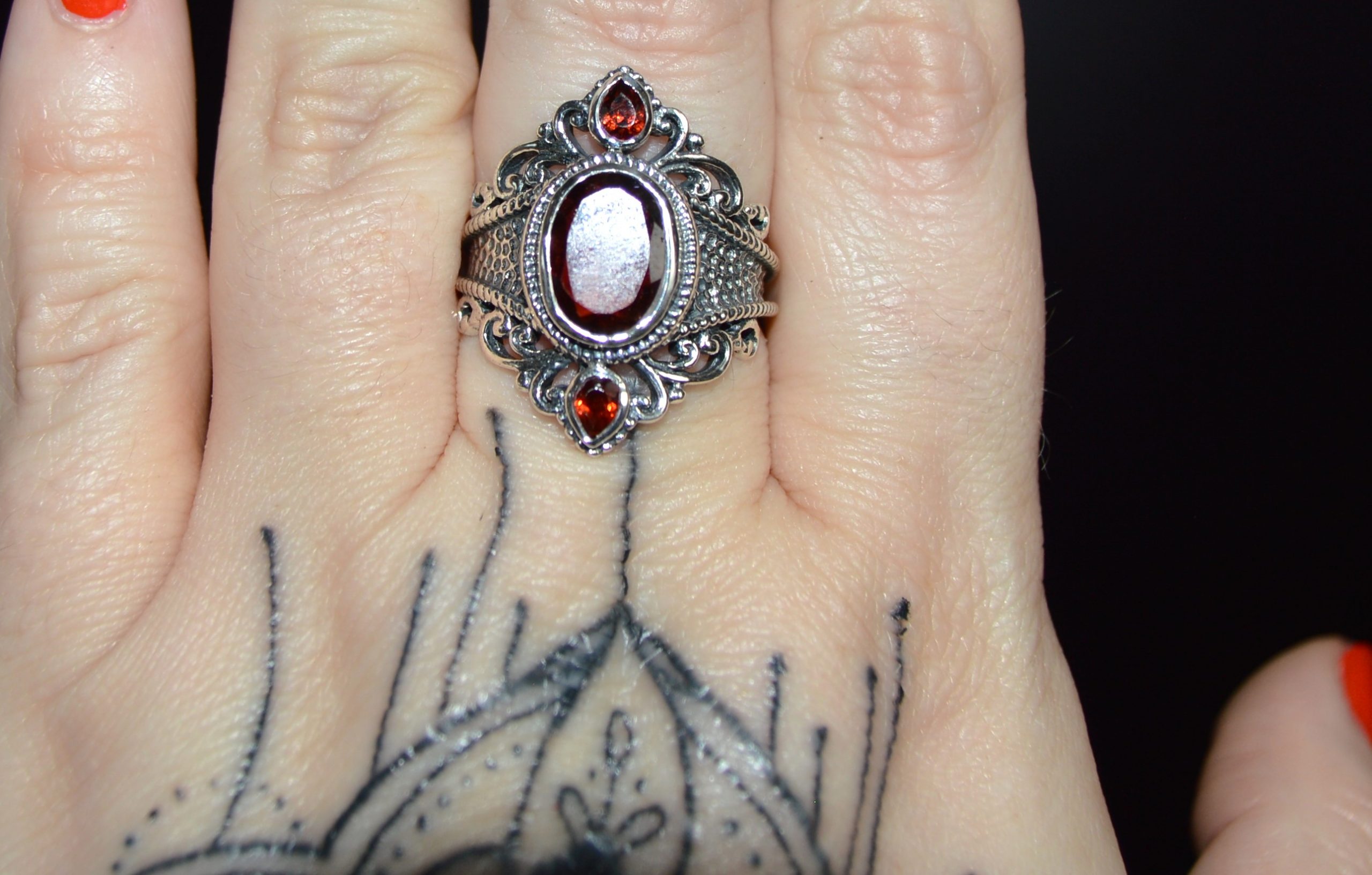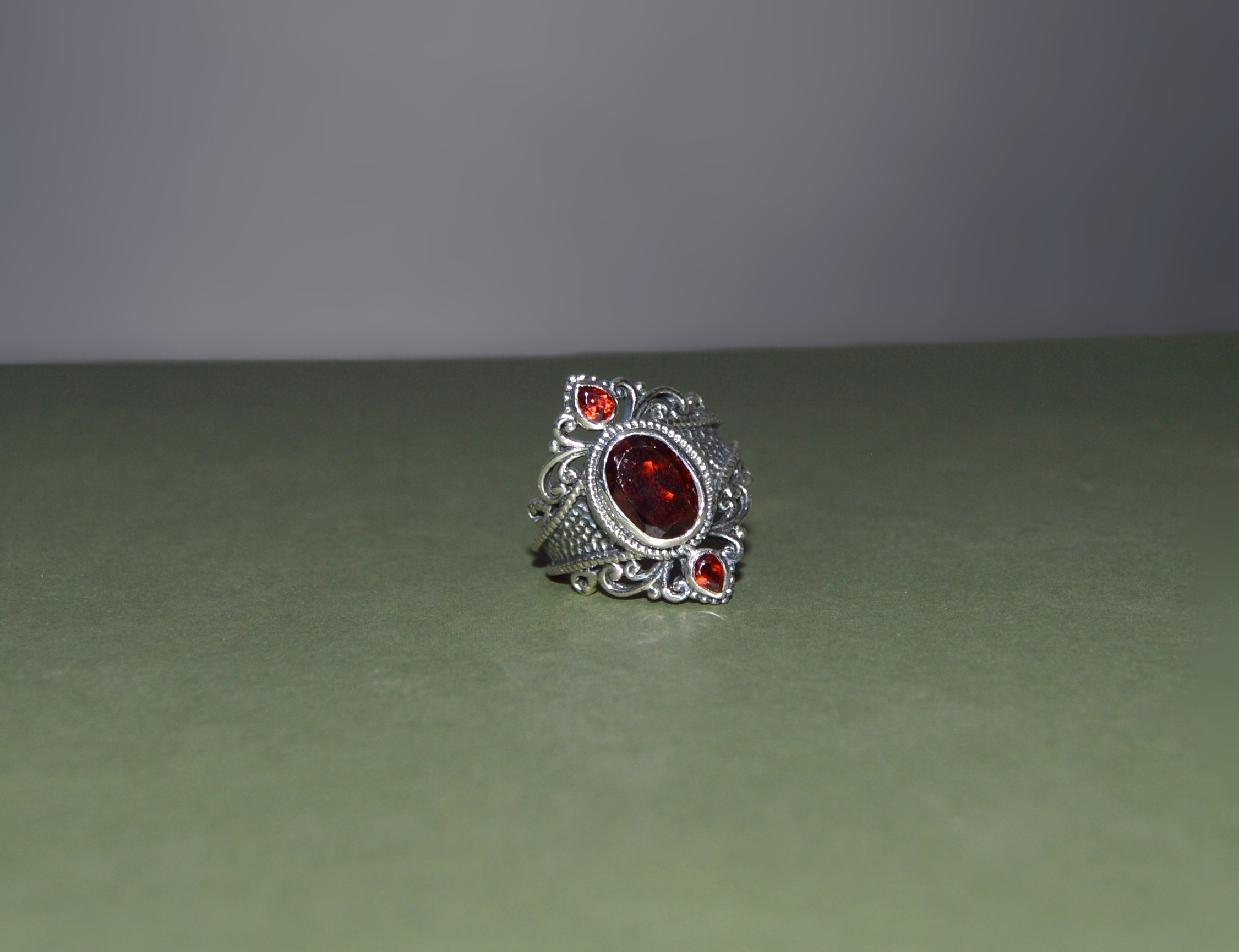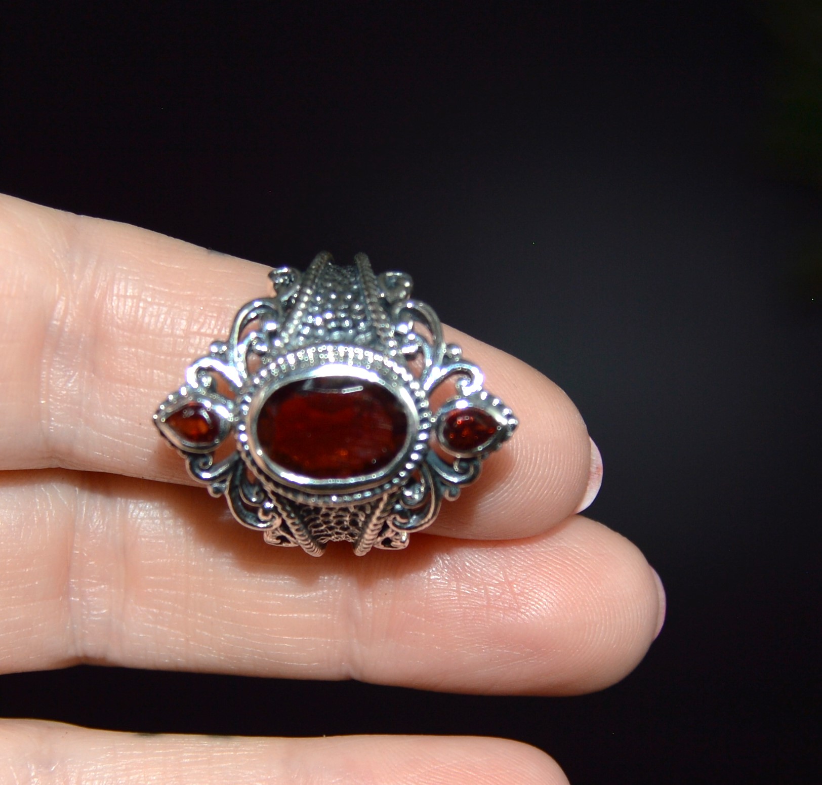 This size 9 ring is a mesmerizing creation, blending gothic elegance with mythical allure. Crafted from sterling silver, the ring features three deep red garnet stones, their rich hues evoking a sense of drama and mystery. The central garnet is slightly larger, commanding attention while flanked by two equally captivating stones. The band is adorned…