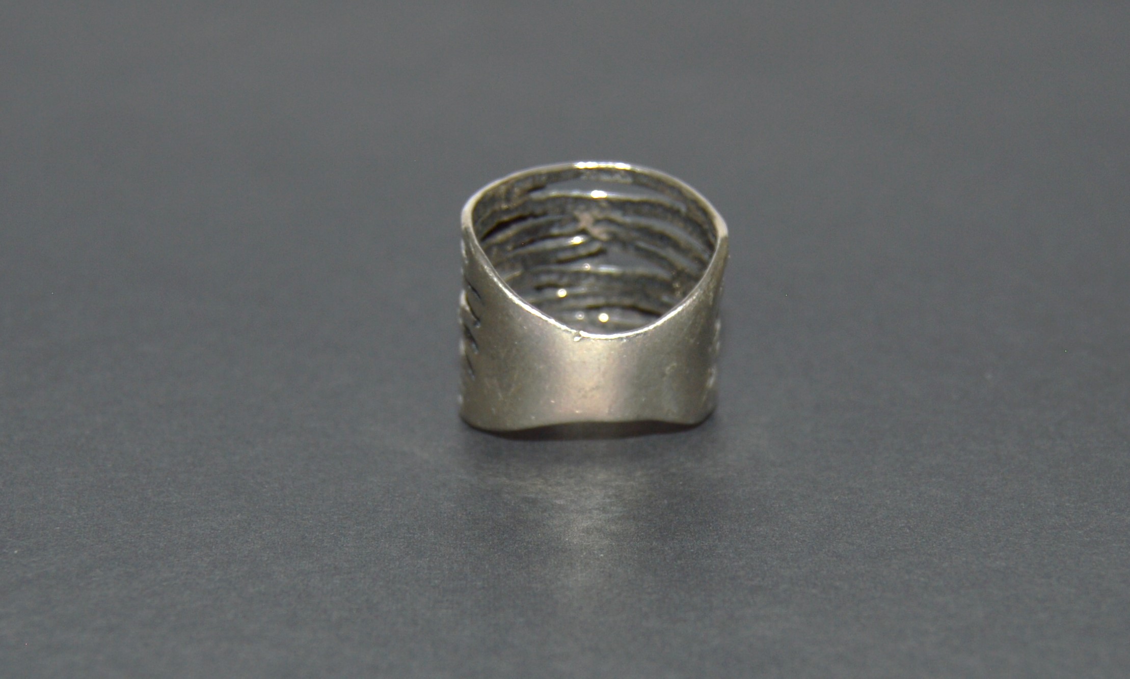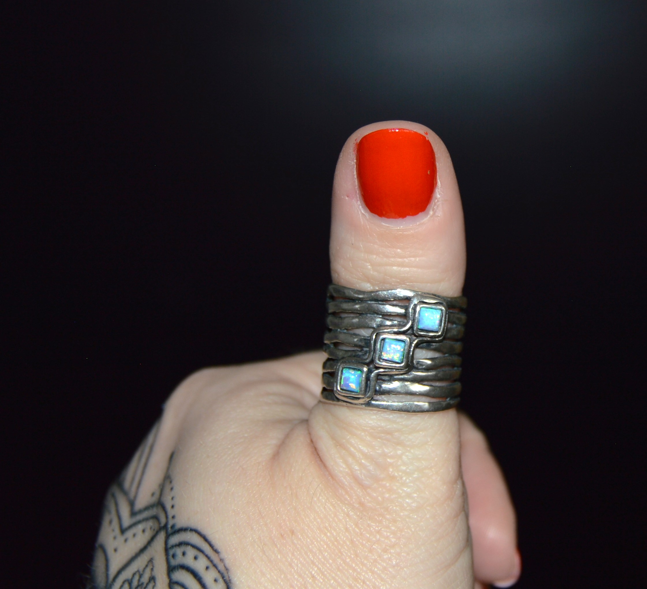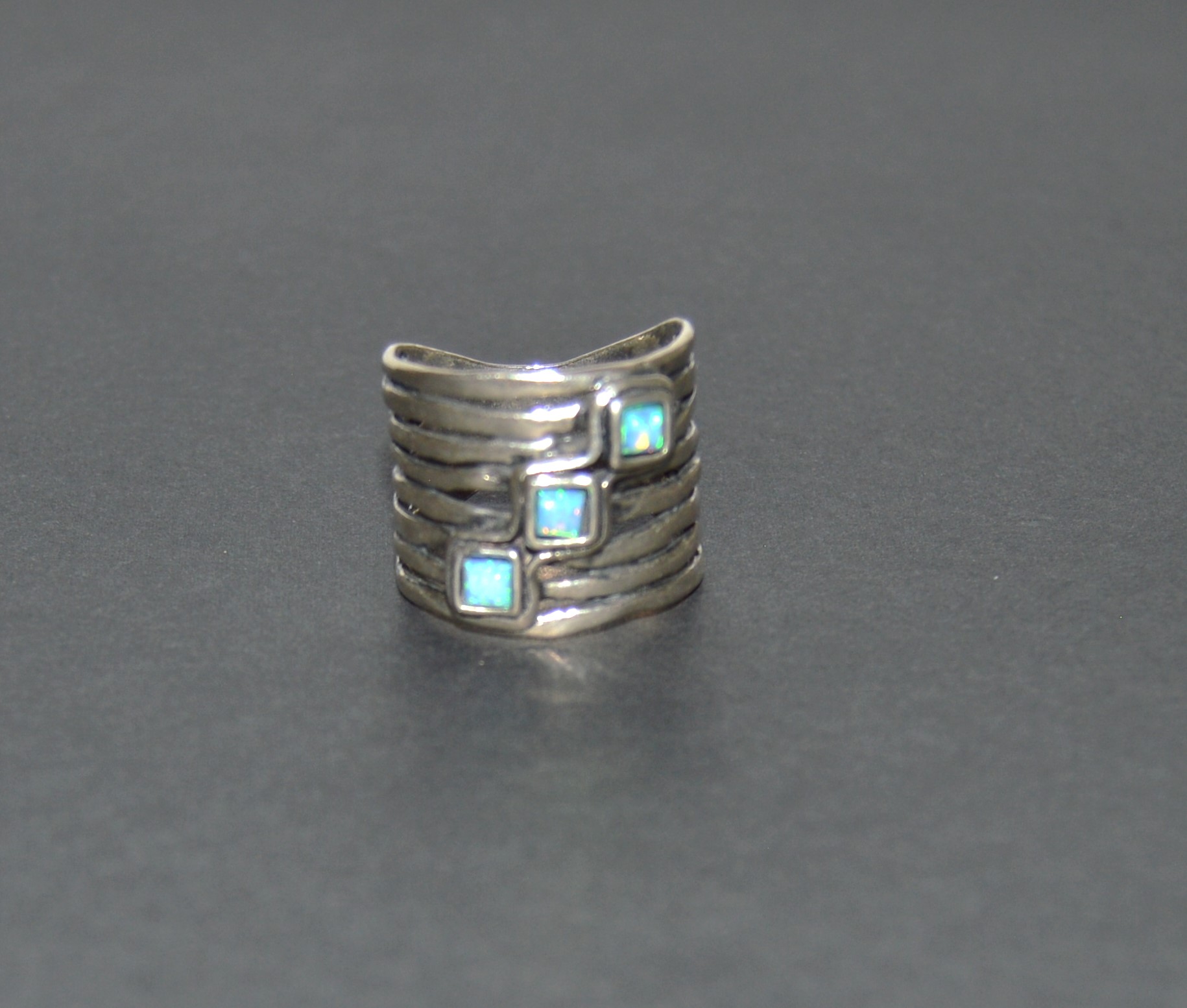 This size 7.75 ring features three radiant blue opal stones, beautifully set on layered sterling silver bands. The triple stone design paired with the layered bands creates a striking look that radiates elegance and individuality.