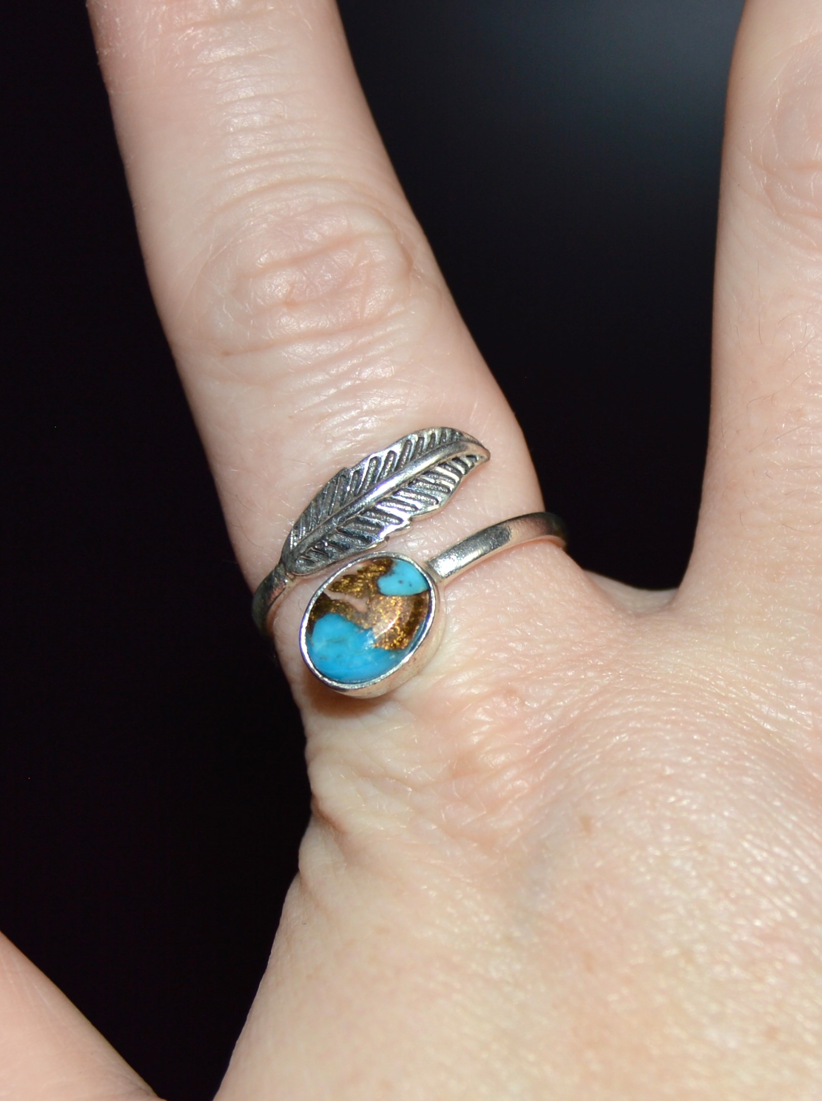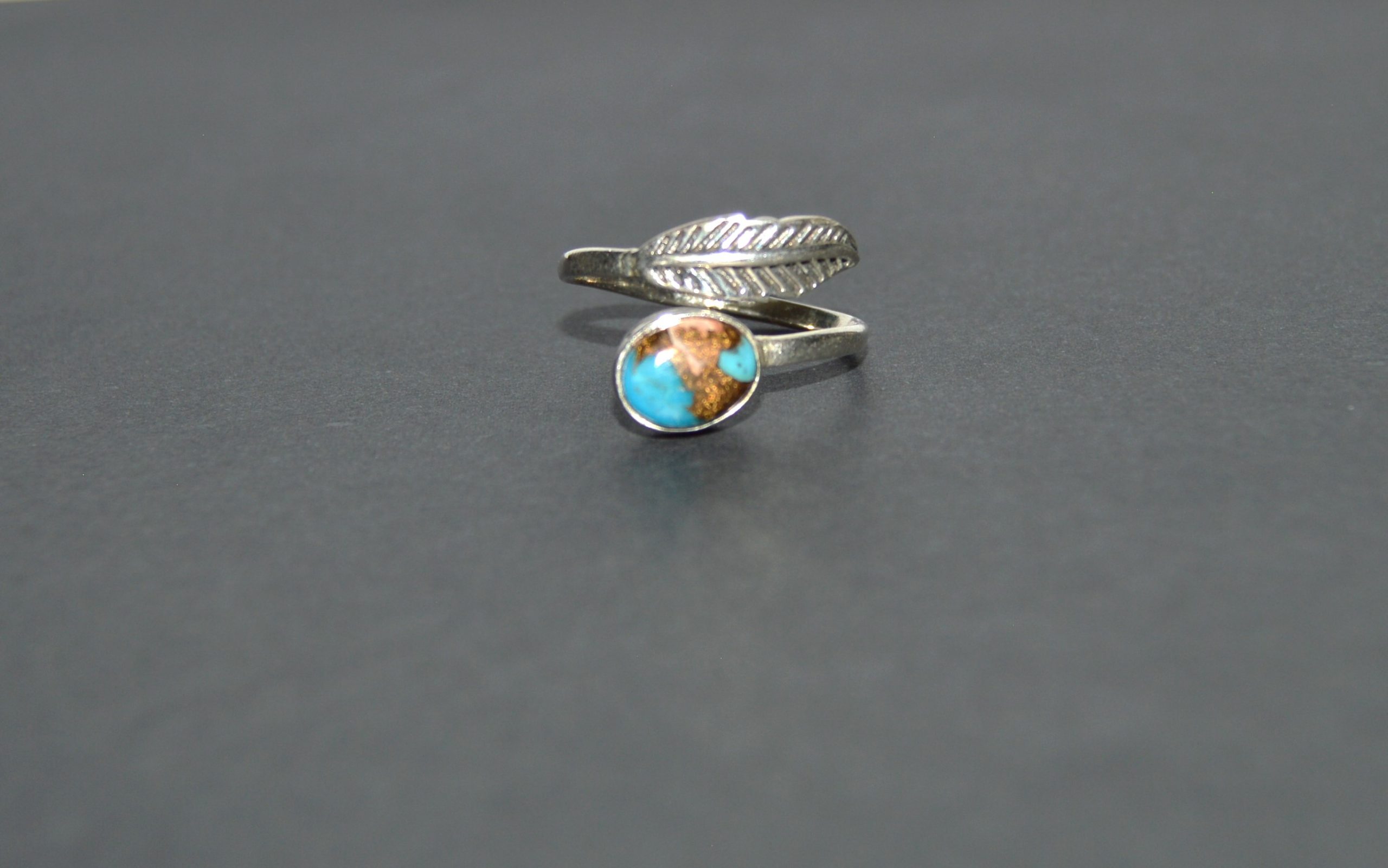 This dainty, adjustable size 8 ring features a captivating small matrix turquoise stone, celebrated for its natural, web-like patterns that make each piece unique. The stone’s vibrant hues are complemented by a sterling silver feather band, intricately detailed to evoke the graceful curves and texture of real feathers. The sterling silver construction ensures lasting quality and a timeless finish, while the adjustable band offers a comfortable fit for a variety of sizes. Ideal for those who love nature-inspired elegance, this ring is a delicate blend of artistry and organic beauty, perfect for everyday wear or special occasions.