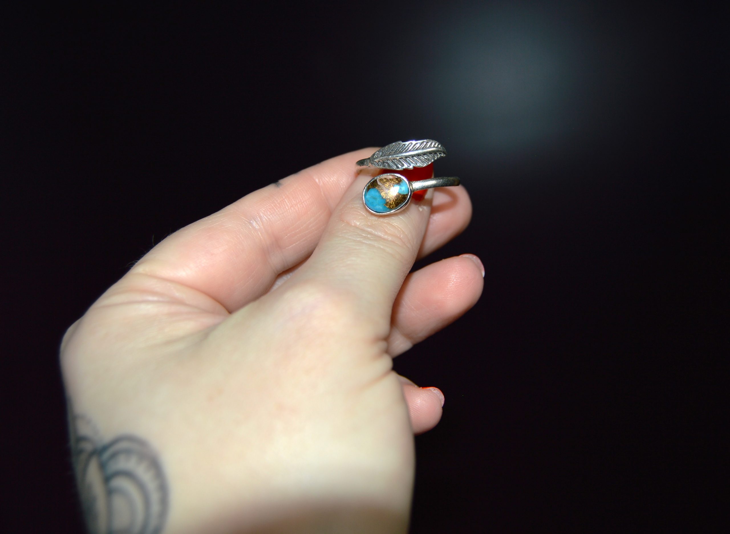 This dainty, adjustable size 8 ring features a captivating small matrix turquoise stone, celebrated for its natural, web-like patterns that make each piece unique. The stone’s vibrant hues are complemented by a sterling silver feather band, intricately detailed to evoke the graceful curves and texture of real feathers. The sterling silver construction ensures lasting quality…