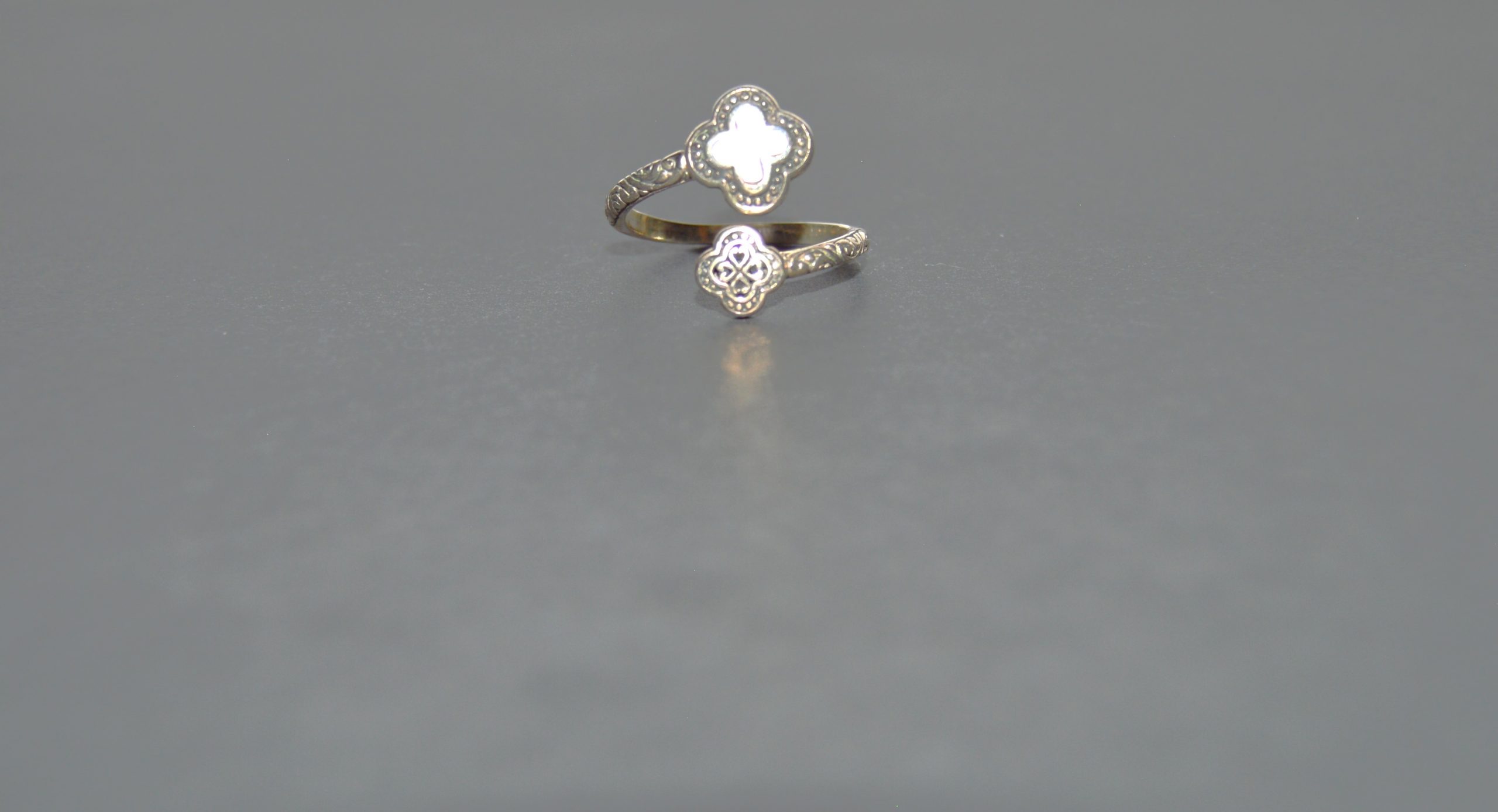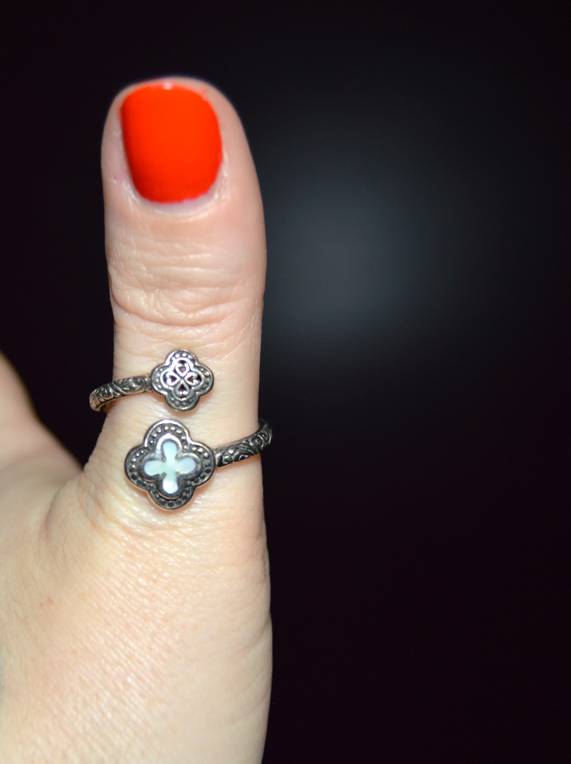 This exquisite ring combines the symbolic Rosicrucian and love knot designs, beautifully intertwined to represent unity and everlasting connection. Crafted with a sterling silver band, it features a luminous mother of pearl that adds a touch of elegance and iridescent charm. A truly meaningful and unique piece for any jewelry collection.