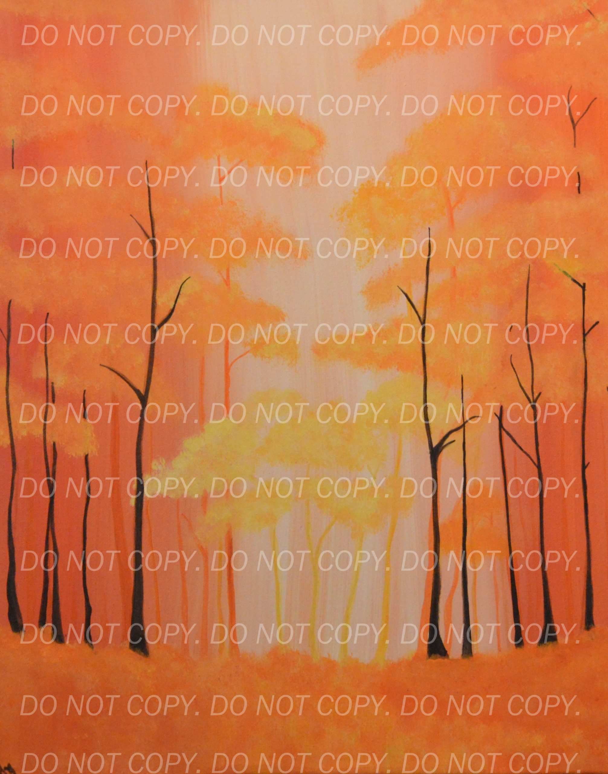 This vibrant orange tree forest painting captures the warm glow of autumn, with rich hues of amber and gold filling the canvas. The soft brushstrokes bring each tree to life, creating a peaceful, natural atmosphere.