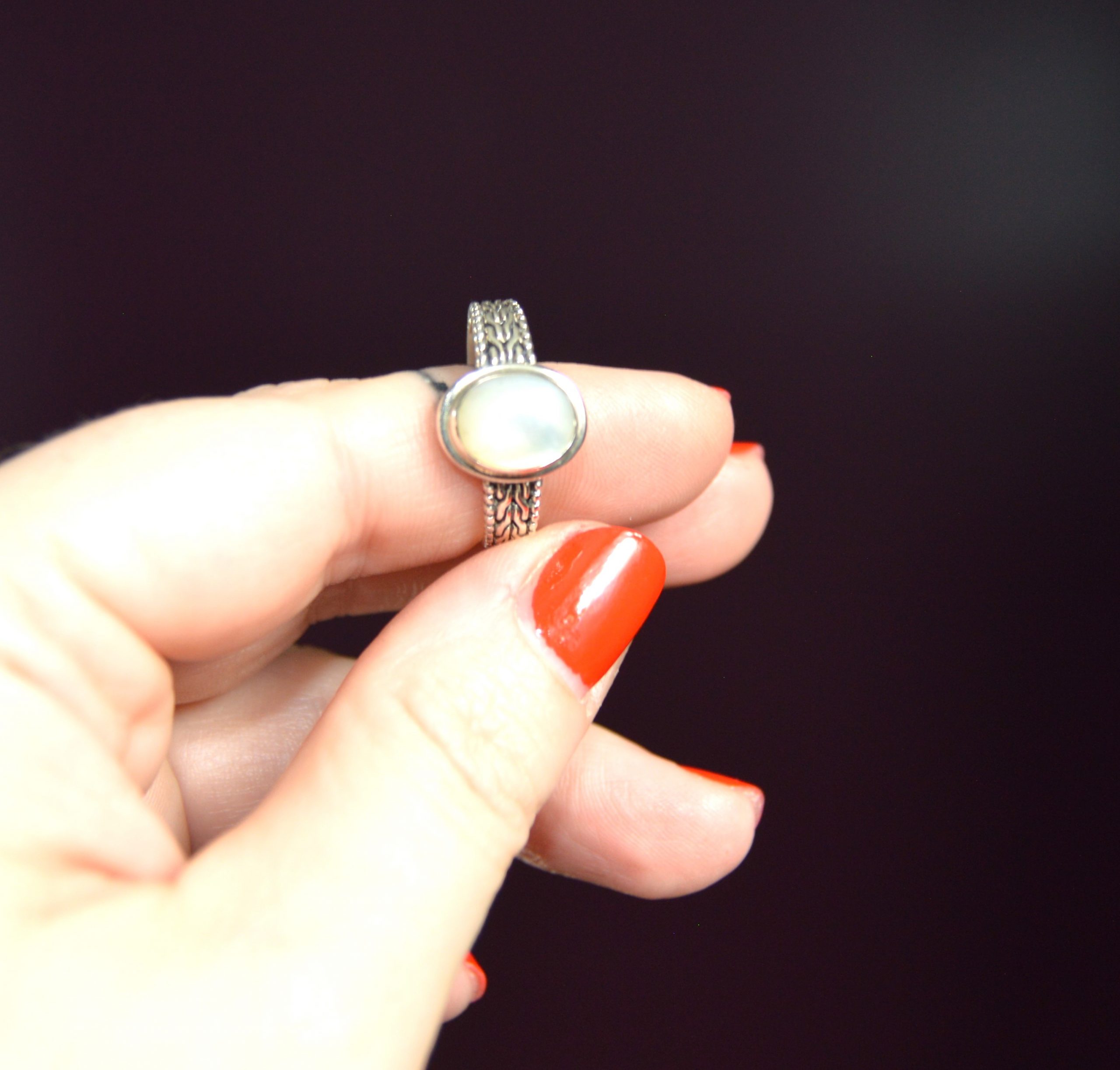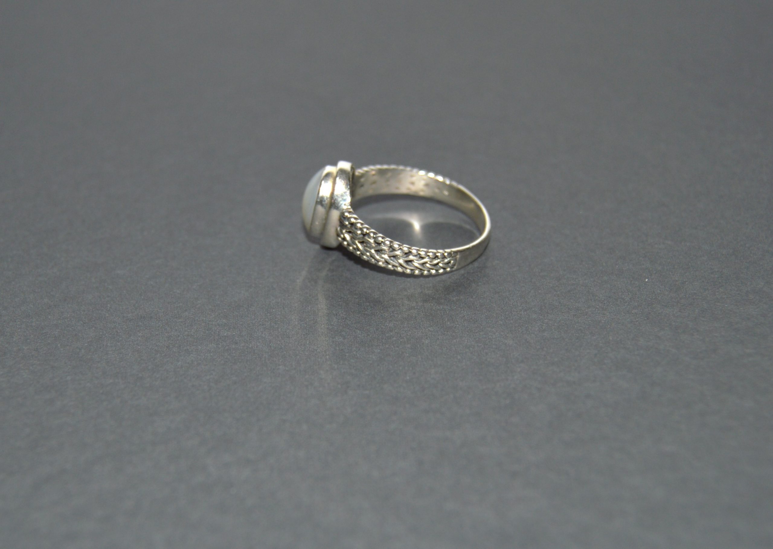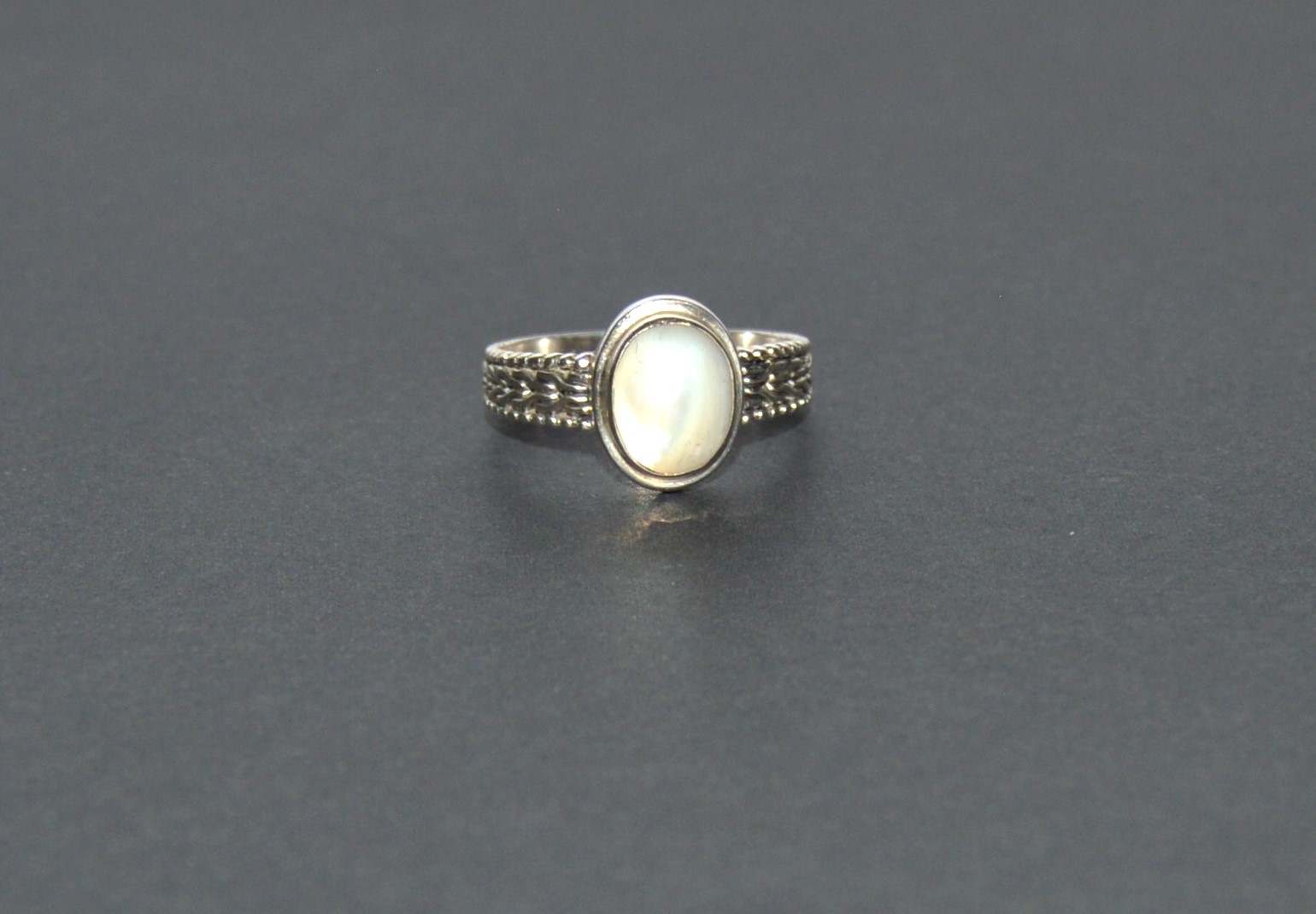 This elegant ring features a sterling silver cable knit band, adding a unique textured design to its refined style. Highlighted with a luminous mother of pearl, this piece captures timeless elegance with a touch of intricate craftsmanship, perfect for any occasion.